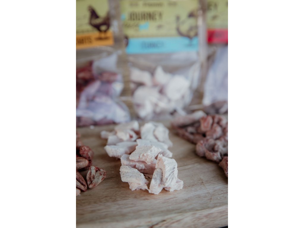 Felii ușoare, slabe și aromate din 100% piept de curcan — bucăți pentru care vor alerga chiar și din somn. Datorită uscării delicate prin congelare (liofilizare), carnea își păstrează gustul natural, aroma și textura, motivând de la prima mirosire. Carnea de curcan este natural slabă, cu un conținut redus de grăsimi, ușor de digerat și bogată în proteine complete; în același timp, este o sursă naturală de vitamine din grupa B (B6, niacină) și minerale precum seleniu și fosfor. Compoziția monoproteică fără cereale, coloranți și conservanți este excelentă și pentru animalele mai sensibile. Și pentru că sunt felii, nu cuburi, se rup ușor, nu se fărâmițează și pot fi purtate comod în buzunar la antrenament. Procesate și ambalate manual în Cehia, la poalele Munților Orlické.