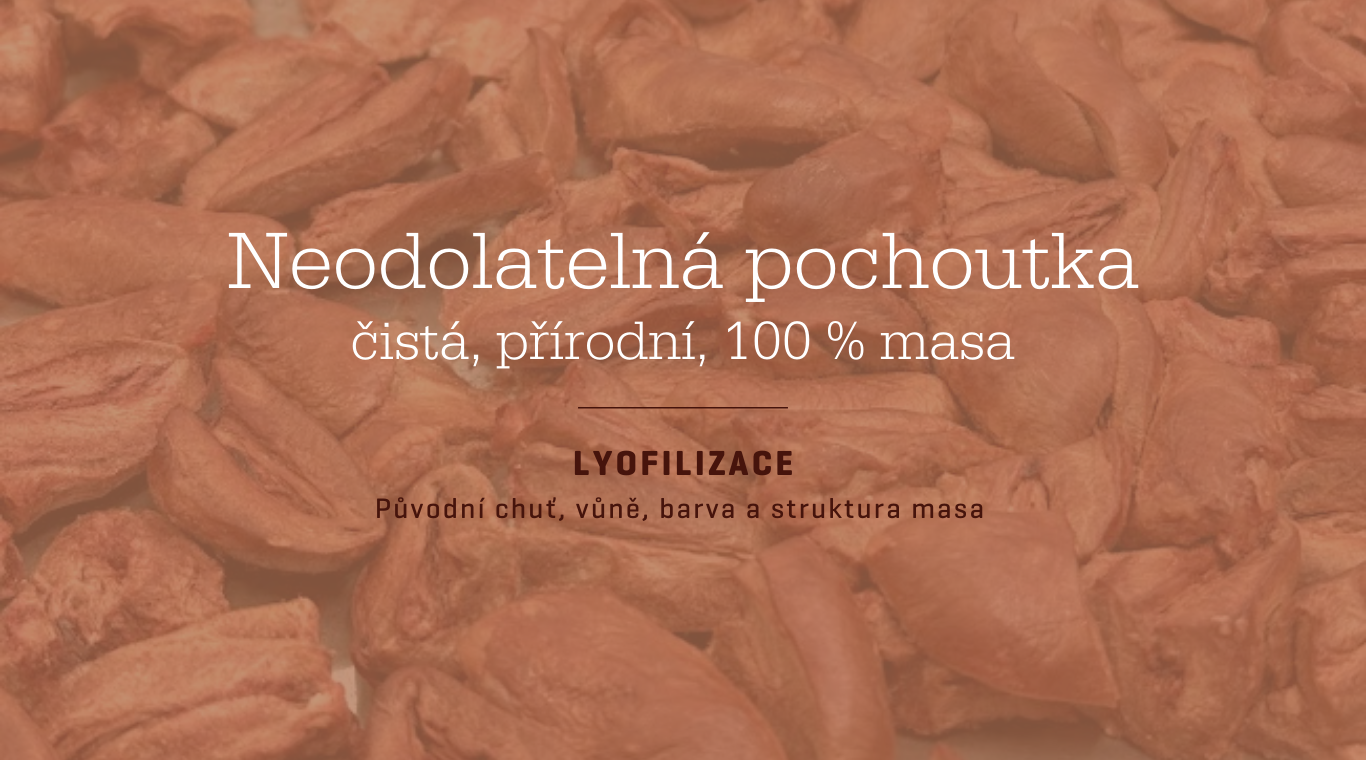 Aromă și gust care fac urechile să se ridice chiar și celor mai pretențioși gurmanzi. În plus, o compoziție curată, fără chimicale inutile. Aceasta este noua noastră gamă de delicatese liofilizate de la poalele Munților Orlické – pregătite manual, din carne atent selectată, pentru câini și pisici.